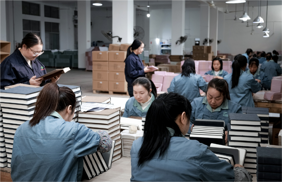 Our core strength is our modern, standardized production facility in Taizhou, which houses a fully integrated, end-to-end manufacturing process. This encompasses printing, binding, inner-page production, and cover fabrication, ensuring seamless quality control, operational efficiency, and reliable supply-chain management. This operation is supported by a dedicated workforce of over 300 professionals, including: